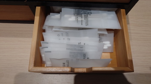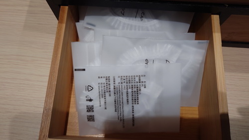 下方抽屜拉出來是四個大禹嶺茶包和四包凱薩濾掛咖啡,